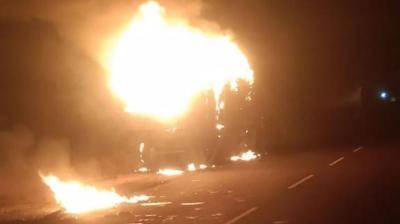 सीहोर वेयरहाउस में आग का तांडव, ट्रक चपेट में; दमकलकर्मियों ने समय रहते पाया काबू