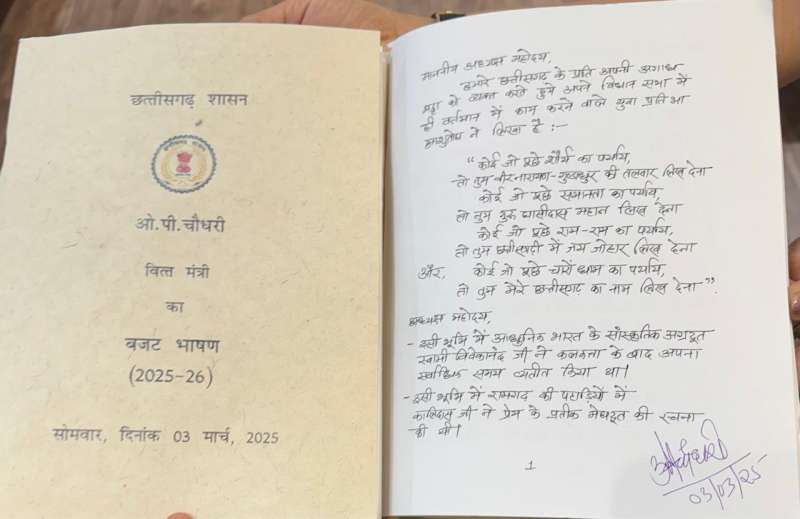 छत्तीसगढ़ में पहली बार हस्तलिखित बजट पेश, वित्त मंत्री ओपी चौधरी ने किए हस्ताक्षर