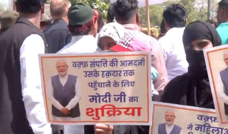 दिल्ली में भी वक्फ विधेयक के समर्थन में मुस्लिम महिलाएं उतरीं। महिलाओं ने तख्तियां पकड़ रखी हैं। इनमें लिखा है कि 'वक्फ संपत्ति की आमदनी उसके हकदार तक पहुंचाने और वक्फ बोर्ड में महिलाओं व पिछड़े मुसलमानों की हिस्सेदारी देने के लिए मोदी जी का शुक्रिया।'