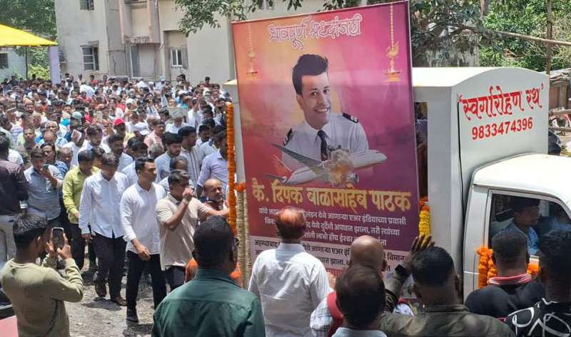 बदलापुर। अहमदाबाद विमान हादसे में जान गंवाने वाले एयर इंडिया के क्रू मेंबर दीपक पाठक को शनिवार को गमगीन माहौल में अंतिम विदाई दी गई। उनके घर के बाहर और श्मशान घाट पर उन्हें अंतिम विदाई देने के लिए भारी भीड़ उमड़ी। इस दौरान उनके परिजन, दोस्त और एयर इंडिया के सहकर्मी की आँखें नम थी। मुंबई से सटे बदलापुर के रहने वाले विमान के क्रू मेंबर दीपक पाठक (34) की भी 12 जून को गुजरात के अहमदाबाद में हुए एयर इंडिया विमान हादसे में मौत हो गई थी। हालांकि विमान हादसे के एक सप्ताह बाद भी दीपक के शव की पहचान नहीं हो पाई थी। दरअसल उनके डीएनए जांच में उसकी बहनों और उसके डीएनए की मेडिकल जांच में दिक्कतें आ रही थीं। इसलिए बाद में उनके माता-पिता के डीएनए सैंपल लिए गए और मां का डीएनए मैच हो गया और पहचान की पुष्टि हो गई। दीपक की दो विवाहित बहनें, भाभी आठ दिनों से उनके शव को अपने कब्जे में लेने के लिए अहमदाबाद में इंतजार कर रही थीं। दीपक के शव की पहचान होने के बाद शुक्रवार देर शाम उनका शव परिजनों को सौंप दिया गया। एयर इंडिया ने उनके पार्थिव शरीर को बदलापुर स्थित उनके घर तक लाने के लिए विशेष विमान की व्यवस्था की थी। शनिवार दोपहर करीब 12.20 बजे दीपक का पार्थिव शरीर बदलापुर स्थित उनके आवास पर लाया गया। अंतिम दर्शन के लिए कुछ देर तक पार्थिव शरीर को घर पर ही रखा गया। बाद में दीपक के पार्थिव शरीर को फूलों से सजे रथ में रखकर बदलापुर के मोहनानंद नगर स्थित वैकुंठधाम श्मशान घाट ले जाया गया और बड़ी संख्या में उपस्थित लोगों के बीच उनका अंतिम संस्कार किया गया। इस दौरान सभी की आखें नम थी और कई लोग फुट फुट कर रो रहे थे।
