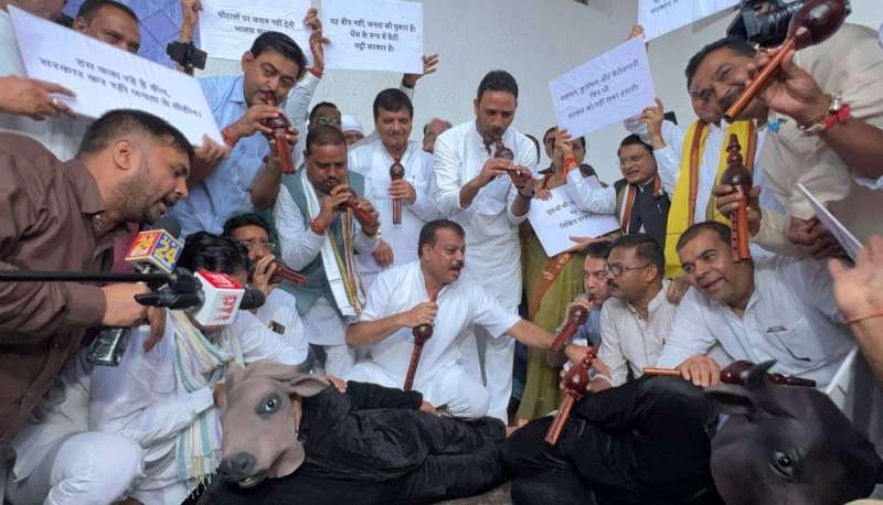 भोपाल : मध्यप्रदेश विधानसभा के मानसून सत्र के दूसरे दिन मंगलवार को विपक्ष ने सरकार सरकार के खिलाफ प्रतिकात्मक प्रदर्शन किया। नेता प्रतिपक्ष उमंग सिंघार के नेतृत्व में कांग्रेस विधायकों ने ‘भैंस के आगे बीन बजाने’ जैसा प्रतीकात्मक विरोध कर भाजपा सरकार पर तीखा हमला बोला। कांग्रेस का कहना हे कि यह विरोध प्रदर्शन सरकार की "संवेदनहीनता" और जनहित के मुद्दों पर "मौन रवैये" के खिलाफ किया गया। प्रदर्शन के दौरान भैंस की प्रतिकृति के साथ कांग्रेस विधायक विधानसभा परिसर पहुंचे और उन्होंने सरकार की नीतियों पर सवाल उठाए। वहीं, सदन में मुख्यमंत्री ने विपक्ष पर तंज कसते हुए कहा कि आज नागपंचमी पर भैंस लेकर आए। कभी गिरगिट लेकर आते हैं। आप चुनेहुए प्रतिनिध हैं। मय्रादा बनाकर रखना चाहिए।