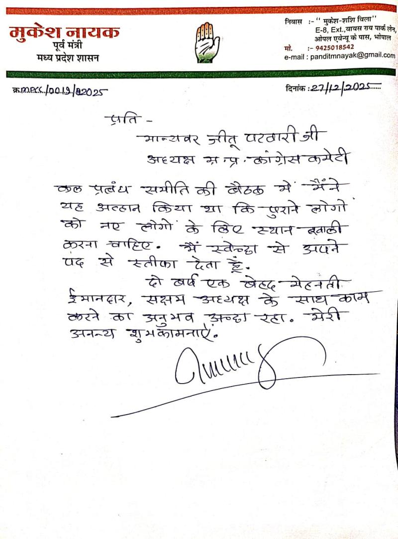 कांग्रेस प्रदेश अध्यक्ष जीतू पटवारी को भेजा इस्तीफा