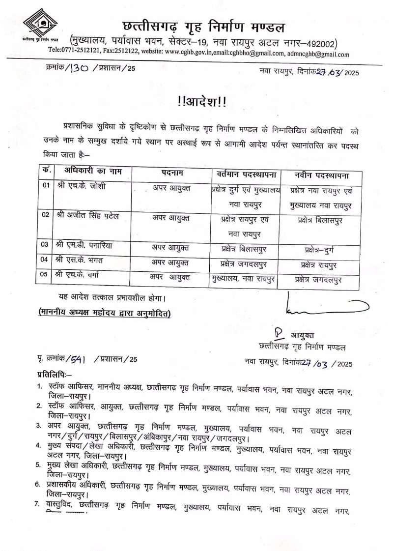 छत्तीसगढ़ हाउसिंग बोर्ड अधिकारियों के तबादले, लिस्ट जारी